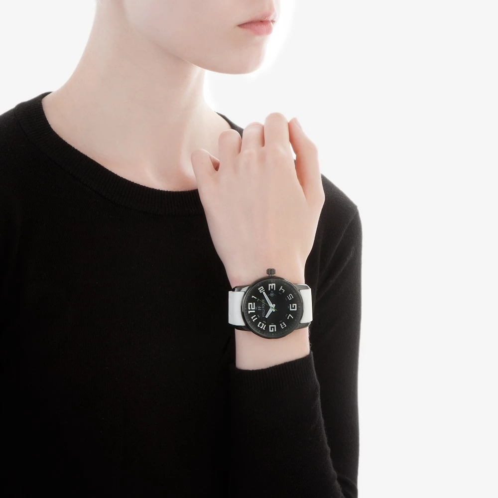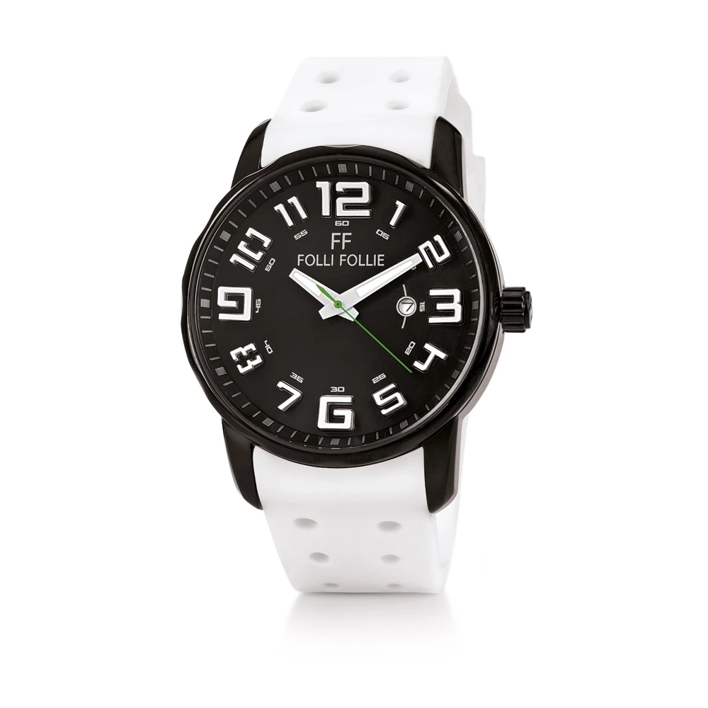 Γυναικείο ρολόι από τη συλλογή Sportime της Folli Follie. Ξεχωρίζει για το εντυπωσιακό λευκό διάτρητο λουράκι του και τα σπορτίφ μαύρα χαρακτηριστικά του. Ιδανική επιλογή για ξεχωριστές καθημερινές εμφανίσεις με έντονο στυλ. Εγγύηση: 2 χρόνια για το μηχανισμό, 6 μήνες για τη μπαταρία.