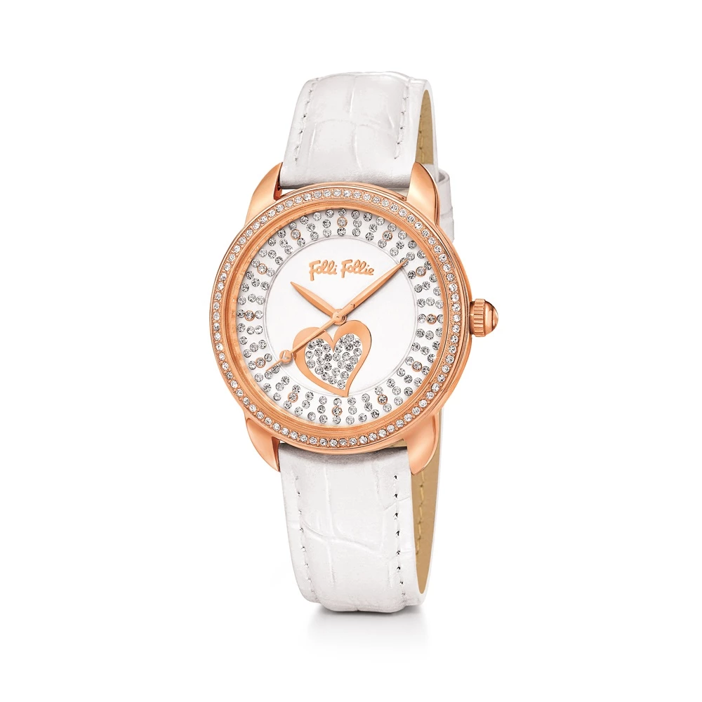 Γυναικείο κομψό ρολόι της Folli Follie με λευκό λουράκι με κροκό εφέ. Διακοσμημένο με αστραφτερές κρυστάλλινες πέτρες στο καντράν και τη κάσα θα χαρίζει μοναδική λάμψη στις πρωινές και βραδινές σας εμφανίσεις. Εγγύηση: 2 χρόνια για το μηχανισμό, 6 μήνες για τη μπαταρία.