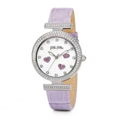 Γυναικείο ρολόι Folli Follie από την συλλογή Desire. Με λεπτό δερμάτινο λουράκι σε λιλά απόχρωση και κάσα από ατσάλι με κρυστάλλινες πέτρες. Το καντράν είναι λευκό και διακοσμείται με τις 3 καρδιές από λιλά κρυστάλλινες πέτρες. Είναι διακριτικό και ιδιαίτερα κομψό!