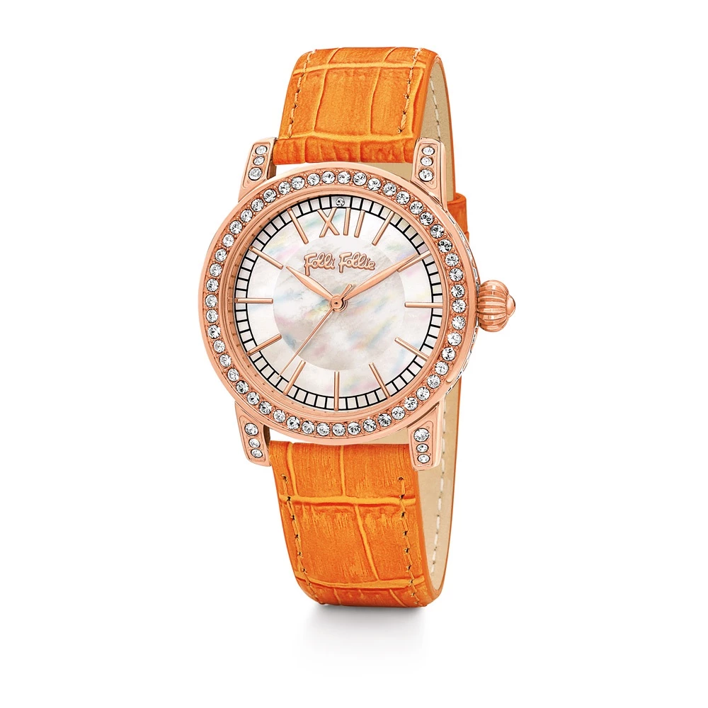 Γυναικείο ρολόι με δερμάτινο λουράκι σε πορτοκαλί απόχρωση, μεσαία στρογγυλή κάσα με ροζ επιχρύσωση και διακοσμημένη από λαμπερές κρυστάλλινες πέτρες. Ένα θηλυκό και κομψό ρολόι, ιδανικό για all day εμφανίσεις. Εγγύηση: 2 χρόνια για το μηχανισμό, 6 μήνες για τη μπαταρία