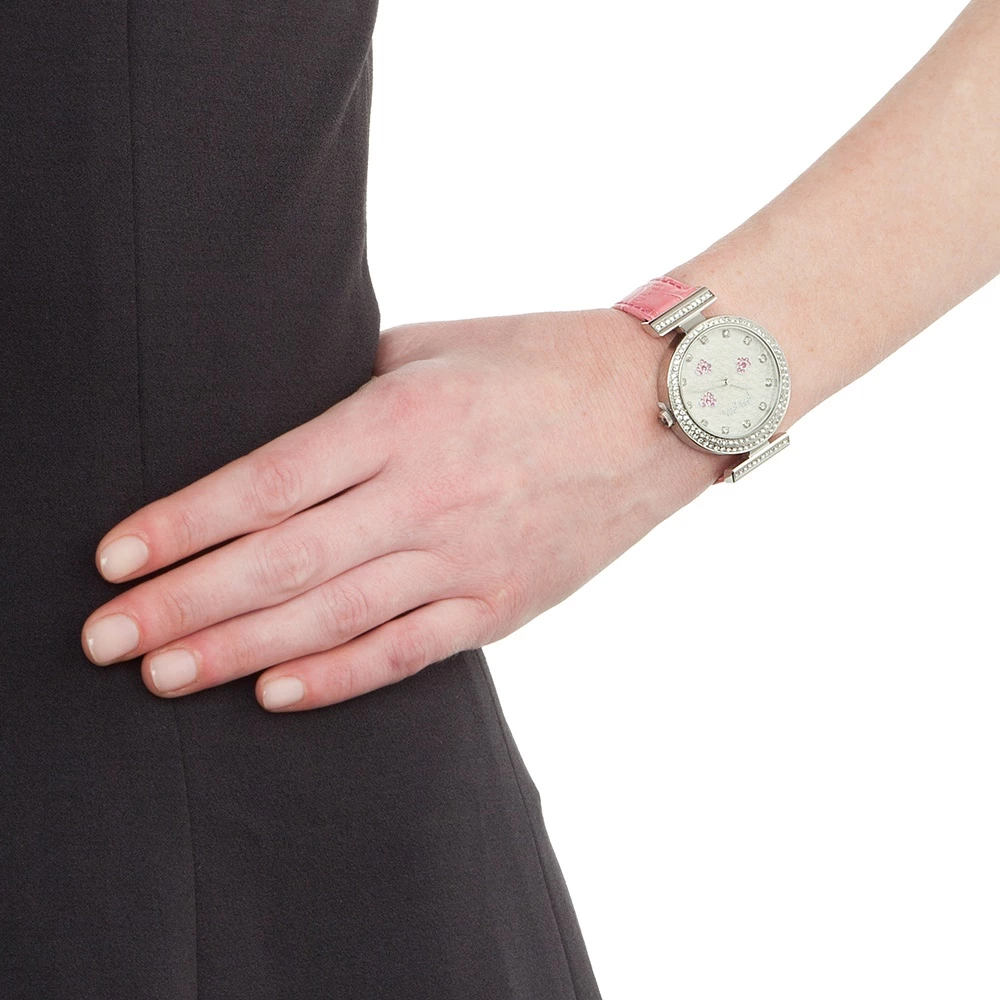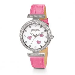 Γυναικείο ρολόι FOLLI FOLLIE από την συλλογή DESIRE. Με δερμάτινο λουράκι σε ροζ απόχρωση και στρογγυλή κάσα από ατσάλι διακοσμημένη με λευκές κρυστάλλινες πέτρες. Λευκό καντράν με κρυστάλλινες πέτρες αντί για αριθμούς και τρεις ροζ καρδιές. Ένα κομψό ρολόι που θα δώσει στιλ και χρώμα στις καθημερινές εμφανίσεις σας.