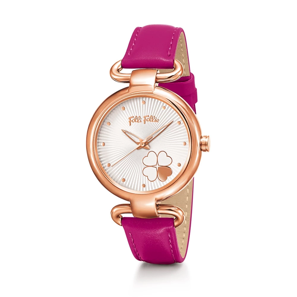 Γυναικείο ρολόι FOLLI FOLLIE από την συλλογή HEART 4 HEART. Με φούξια δερμάτινο λουράκι και στρογγυλή κάσα από επιμεταλλωμένο ροζ χρυσό ατσάλι. Λευκό καντράν με μικρό μοτίβο τις χαρακτηριστικές τέσσερις καρδιές στον δείκτη 5. Ένα κομψό ρολόι που θα δώσει στιλ και χρώμα σε όλες τις εμφανίσεις σας.