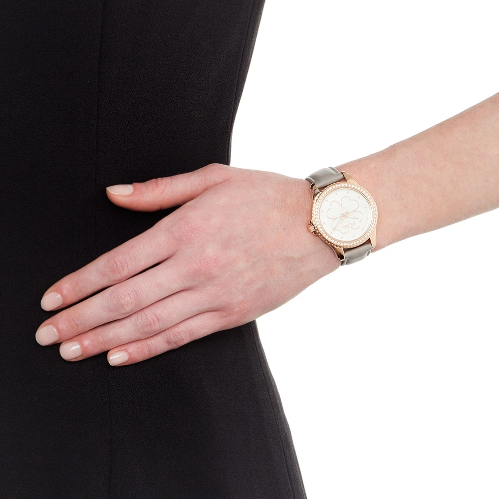 Γυναικείο ρολόι FOLLI FOLLIE από την συλλογή HEART 4 HEART. Με γκρι δερμάτινο λουράκι και στρογγυλή κάσα από επιμεταλλωμένο ροζ χρυσό ατσάλι, διακοσμημένη περιμετρικά με κρυστάλλινες πέτρες. Λευκό καντράν με μοτίβο τις χαρακτηριστικές τέσσερεις καρδιές, και κρυστάλλινες πέτρες για αριθμούς. Ένα κομψό ρολόι που θα δώσει στιλ και χρώμα στις καθημερινές σας εμφανίσεις.