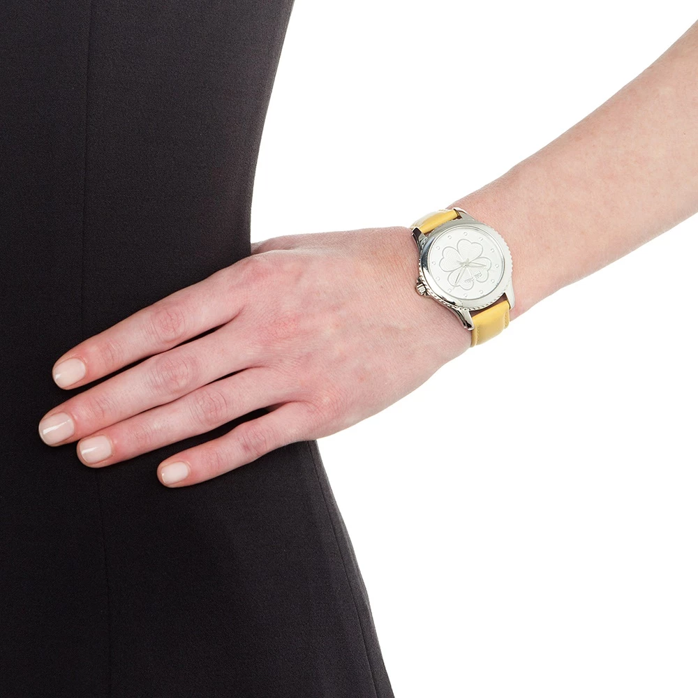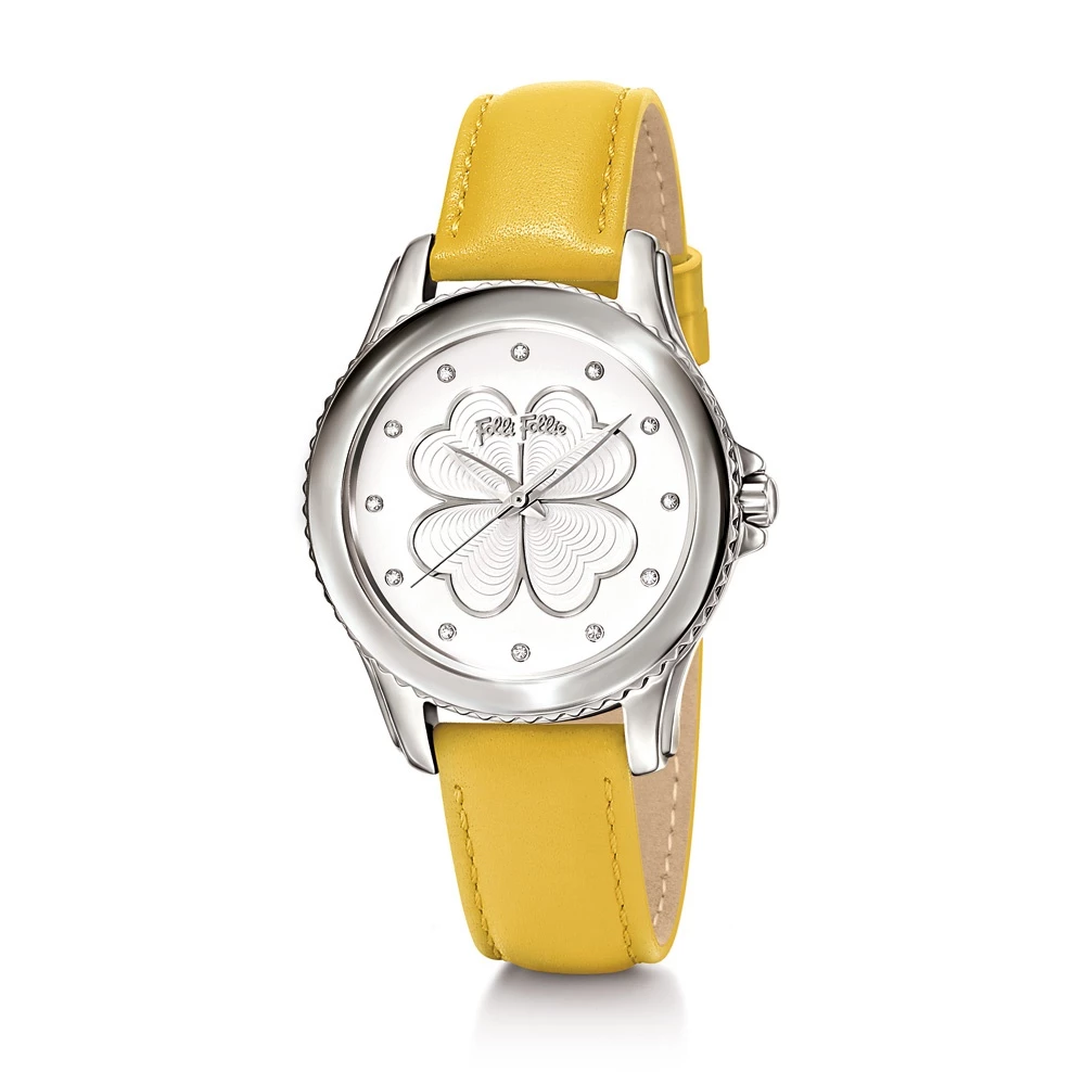 Γυναικείο ρολόι FOLLI FOLLIE από την συλλογή HEART 4 HEART. Με κίτρινο δερμάτινο λουράκι και στρογγυλή κάσα από ανοξείδωτο ατσάλι. Ασημί καντράν με μοτίβο τις χαρακτηριστικές τέσσερις καρδιές, και κρυστάλλινες πέτρες για αριθμούς. Ένα κομψό ρολόι που θα δώσει στιλ και χρώμα στις καθημερινές σας εμφανίσεις.