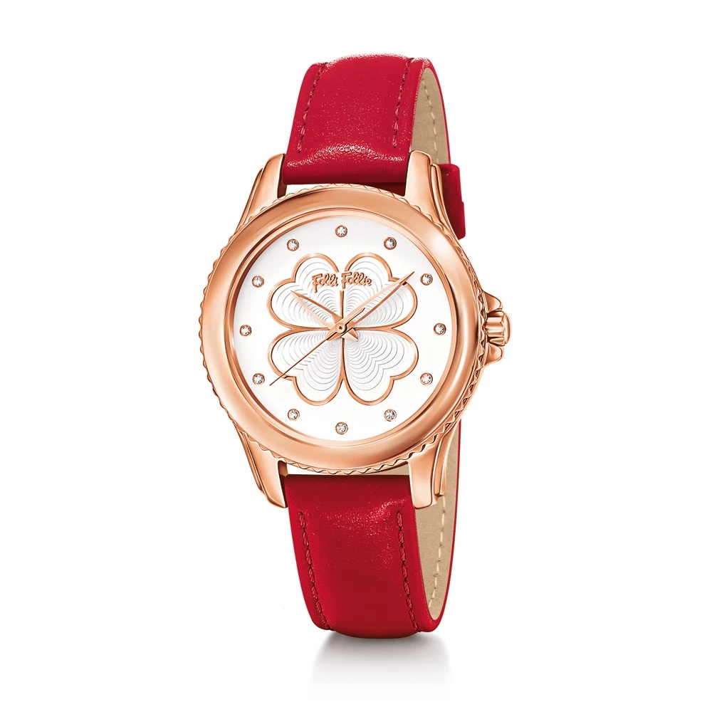 Γυναικείο ρολόι FOLLI FOLLIE από την συλλογή HEART 4 HEART. Με κόκκινο δερμάτινο λουράκι και στρογγυλή κάσα από επιμεταλλωμένο ροζ χρυσό ατσάλι. Λευκό καντράν με μοτίβο τις χαρακτηριστικές τέσσερεις καρδιές, και κρυστάλλινες πέτρες για αριθμούς. Ένα κομψό ρολόι που θα δώσει στιλ και χρώμα στις καθημερινές σας εμφανίσεις.