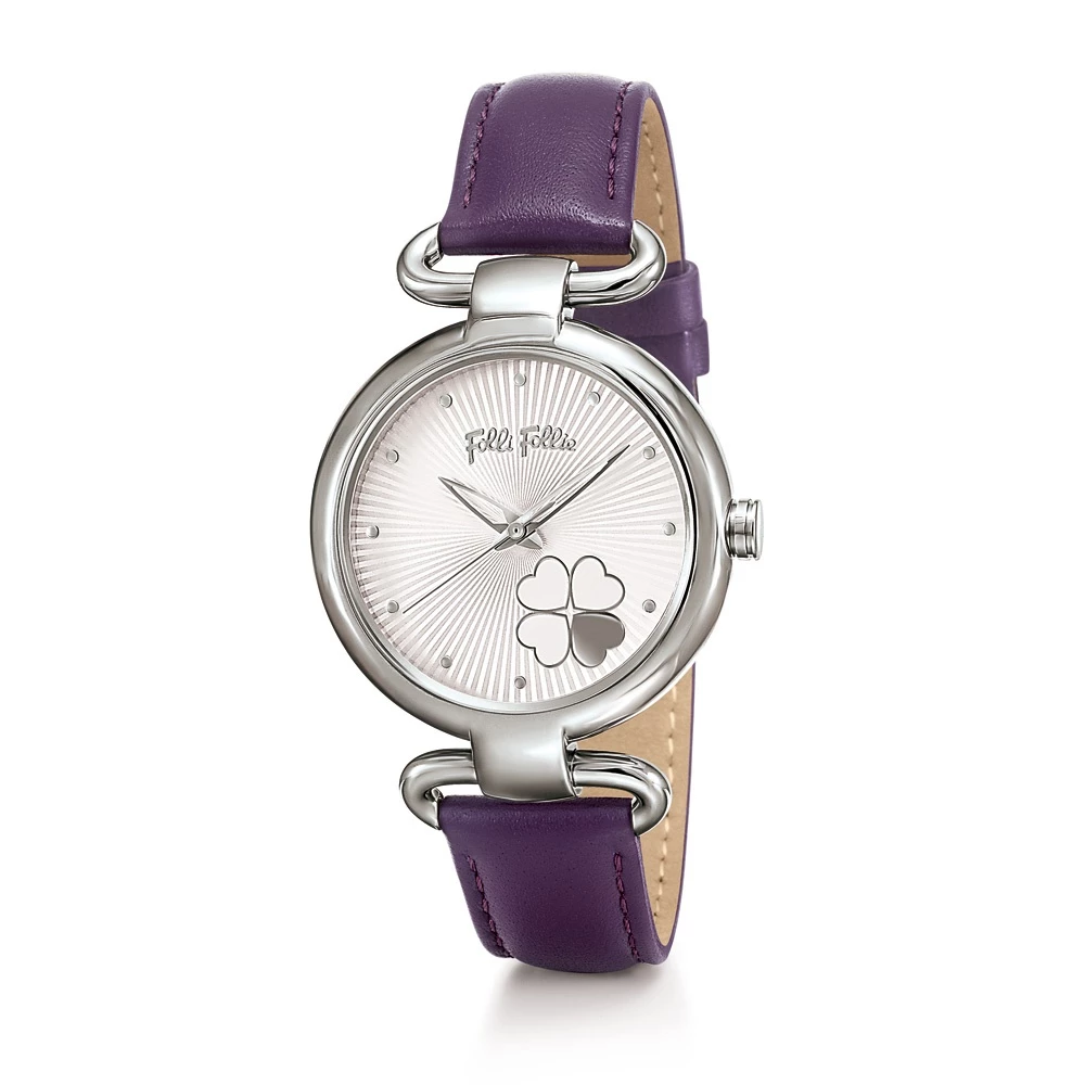 Γυναικείο ρολόι FOLLI FOLLIE από την συλλογή HEART 4 HEART. Με μωβ δερμάτινο λουράκι και στρογγυλή κάσα από ανοξείδωτο ατσάλι. Λευκό καντράν με μικρό μοτίβο τις χαρακτηριστικές τέσσερεις καρδιές στον δείκτη 5. Ένα κομψό ρολόι που θα δώσει στιλ και χρώμα σε όλες τις εμφανίσεις σας.