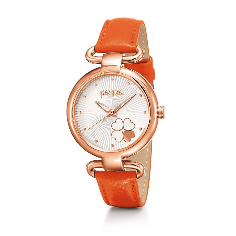 Γυναικείο ρολόι FOLLI FOLLIE από την συλλογή HEART 4 HEART. Με πορτοκαλί δερμάτινο λουράκι και στρογγυλή κάσα από επιμεταλλωμένο ροζ χρυσό ατσάλι. Λευκό καντράν με μικρό μοτίβο τις χαρακτηριστικές τέσσερις καρδιές στον δείκτη 5. Ένα κομψό ρολόι που θα δώσει στιλ και χρώμα σε όλες τις εμφανίσεις σας.