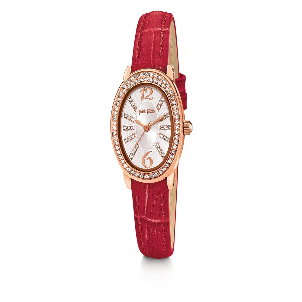 Γυναικείο ρολόι FOLLI FOLLIE από την συλλογή IVY. Με λεπτό δερμάτινο λουράκι σε κόκκινο χρώμα. Μικρή οβάλ κάσα με λευκές κρυστάλλινες διακοσμητικές πέτρες. Λευκό ασημί καντράν με αριθμούς και κρυστάλλινες πέτρες. Ένα κομψό ρολόι που θα δώσει λάμψη σε όλες τις εμφανίσεις σας.
