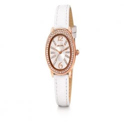 Γυναικείο ρολόι FOLLI FOLLIE από την συλλογή IVY. Με λεπτό δερμάτινο λουράκι σε λευκό χρώμα. Μικρή οβάλ κάσα με λευκές κρυστάλλινες διακοσμητικές πέτρες. Λευκό ασημί καντράν με αριθμούς και κρυστάλλινες πέτρες. Ένα κομψό ρολόι που θα δώσει λάμψη σε όλες τις εμφανίσεις σας.