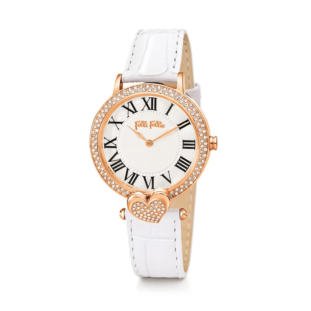 Γυναικείο ρολόι FOLLI FOLLIE από την συλλογή LOVE&FORTUNE. Με δερμάτινο λουράκι σε λευκό χρώμα και στρογγυλή κάσα από επιμεταλλωμένο ροζ χρυσό ατσάλι με λευκές κρυστάλλινες διακοσμητικές πέτρες και μικρό H4H. Λευκό καντράν με κρυστάλλινες πέτρες αντί για αριθμούς. Ένα κομψό ρολόι που θα δώσει στιλ και χρώμα στις καθημερινές εμφανίσεις σας.