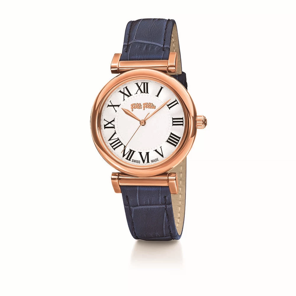 Γυναικείο ρολόι FOLLI FOLLIE από την συλλογή OBSESSION. Με μπλε δερμάτινο λουράκι και στρογγυλή κάσα από επιμεταλλωμένο ροζ χρυσό ατσάλι. Λευκό καντράν με λατινικούς αριθμούς. Ένα κομψό ρολόι που θα δώσει στιλ και χρώμα σε όλες τις εμφανίσεις σας.
