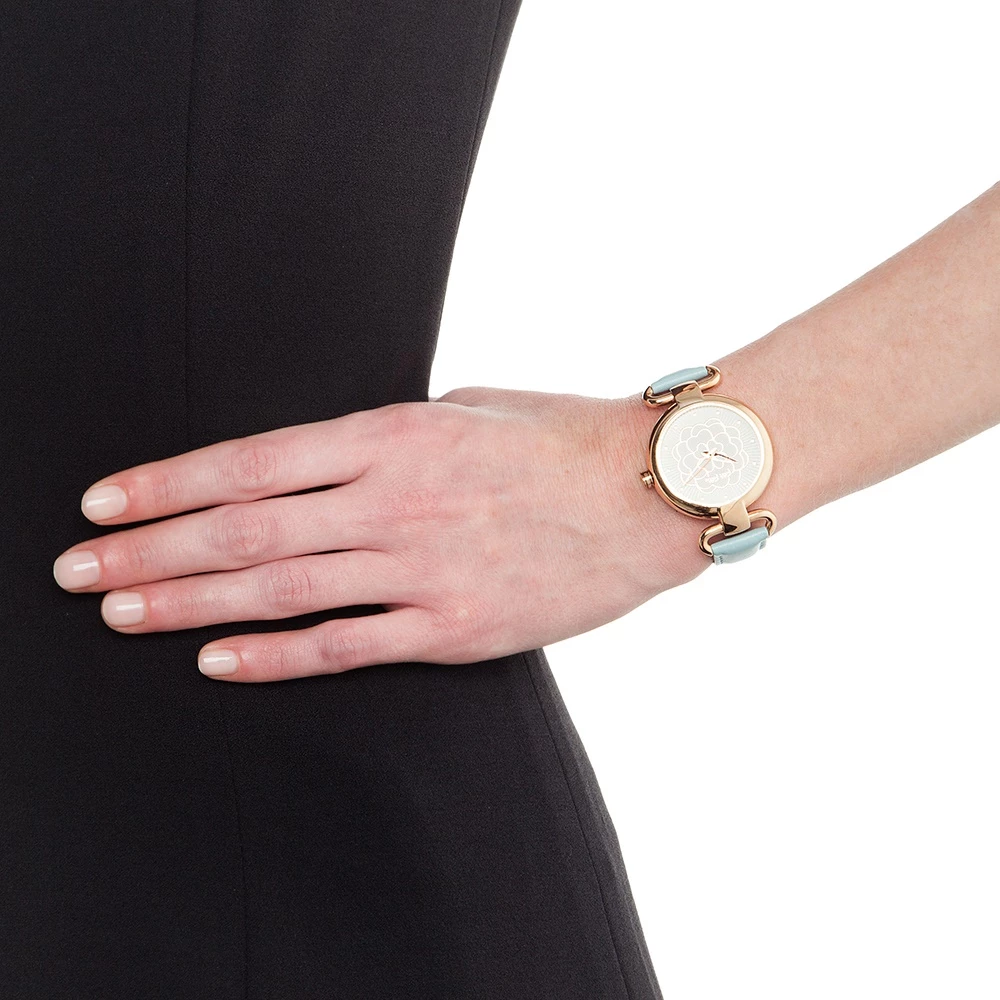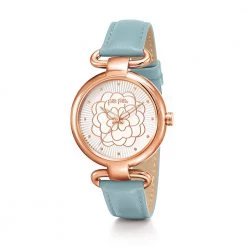 Γυναικείο ρολόι FOLLI FOLLIE από την συλλογή SANTORINI FLOWER. Με γαλάζιο δερμάτινο λουράκι και στρογγυλή κάσα από επιμεταλλωμένο ροζ χρυσό ατσάλι. Λευκό καντράν με μοτιβο το λουλούδι της Σαντορίνης. Ένα κομψό ρολόι που θα δώσει στιλ και χρώμα σε όλες τις εμφανίσεις σας.