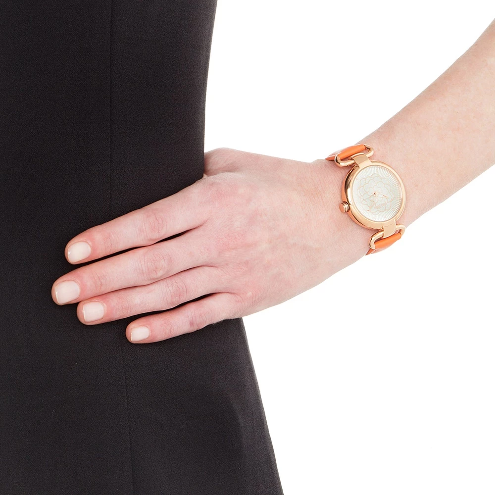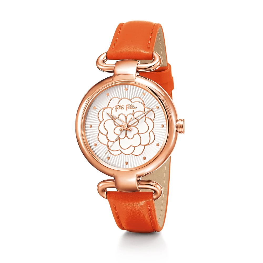 Γυναικείο ρολόι FOLLI FOLLIE από την συλλογή SANTORINI FLOWER. Με πορτοκαλί δερμάτινο λουράκι και στρογγυλή κάσα από επιμεταλλωμένο ροζ χρυσό ατσάλι. Λευκό καντράν με το λουλούδι της Σαντορίνης. Ένα κομψό ρολόι που θα δώσει στιλ και χρώμα σε όλες τις εμφανίσεις σας.
