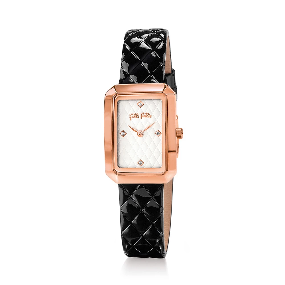 Γυναικείο ρολόι FOLLI FOLLIE από την συλλογή STYLE CODE. Με μαύρο λουράκι από ανάγλυφο γυαλιστερό δέρμα. Τετράγωνη κάσα από επιμεταλλωμένο ροζ χρυσό ατσάλι. Λευκό καντράν με λευκές κρυστάλλινες πέτρες αντί για αριθμούς. Ένα κομψό ρολόι που θα δώσει στιλ και χρώμα σε όλες τις εμφανίσεις σας.
