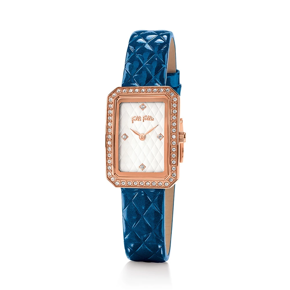 Γυναικείο ρολόι FOLLI FOLLIE από την συλλογή STYLE CODE. Με μπλε λουράκι από ανάγλυφο γυαλιστερό δέρμα. Τετράγωνη κάσα από επιμεταλλωμένο ροζ χρυσό ατσάλι και λευκές διακοσμητικές κρυστάλλινες πέτρες. Λευκό καντράν με κρυστάλλινες πέτρες αντί για αριθμούς. Ένα κομψό ρολόι που θα δώσει στιλ και χρώμα σε όλες τις εμφανίσεις σας.