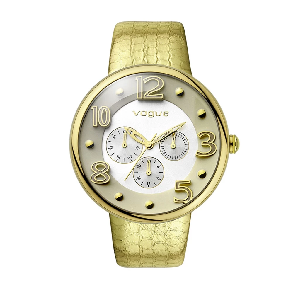 Γυναικείο ρολόι VOGUE με χρυσό δερμάτινο λουράκι και μπεζ καντράν με τρισδιάστατους αριθμούς και χρονογράφους.
