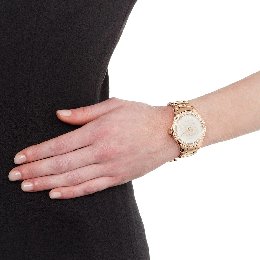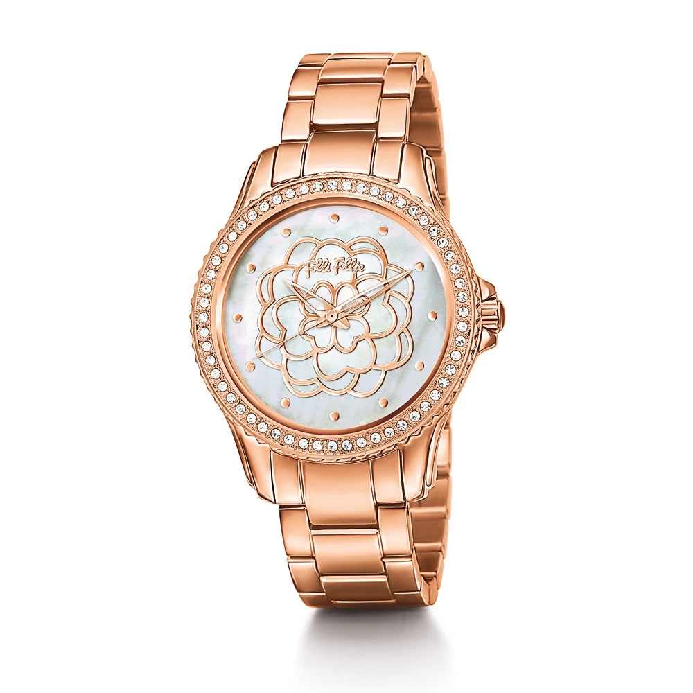 Με το χαρακτηριστικό ανάγλυφο λουλούδι της συλλογής, θηλυκό mother of pearl καντράν, διάφανες κρυστάλλινες πέτρες και επιχρυσωμένo ροζ μπρασελέ, το ρολόι Santorini Flower αποτελεί την ιδανική πρόταση για τις γυναίκες που λατρεύουν τις πολυτελείς λεπτομέρειες.
