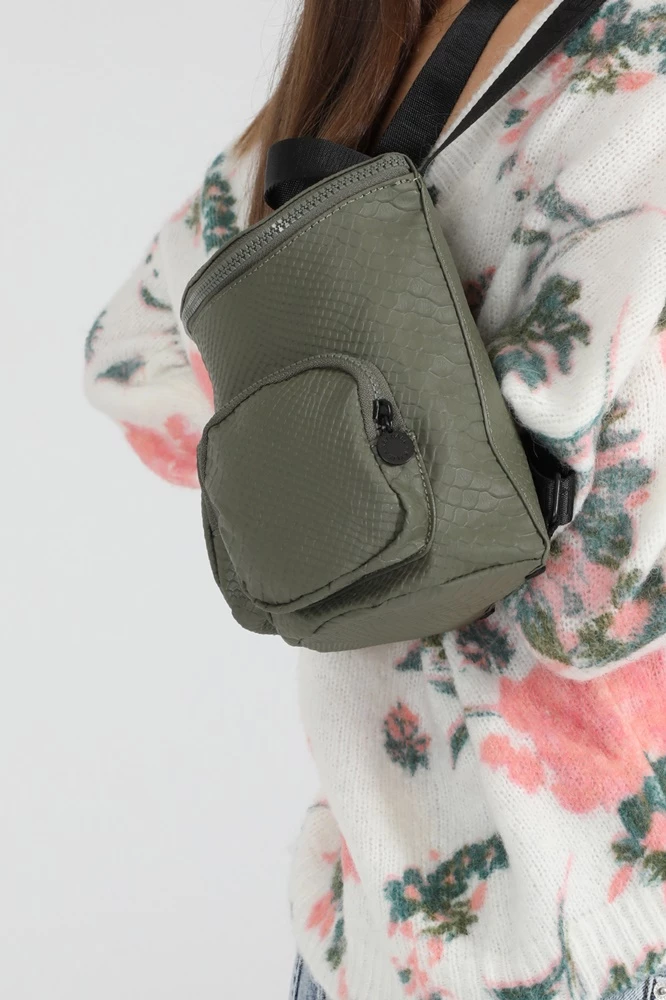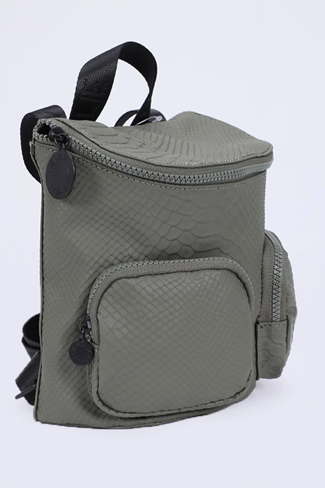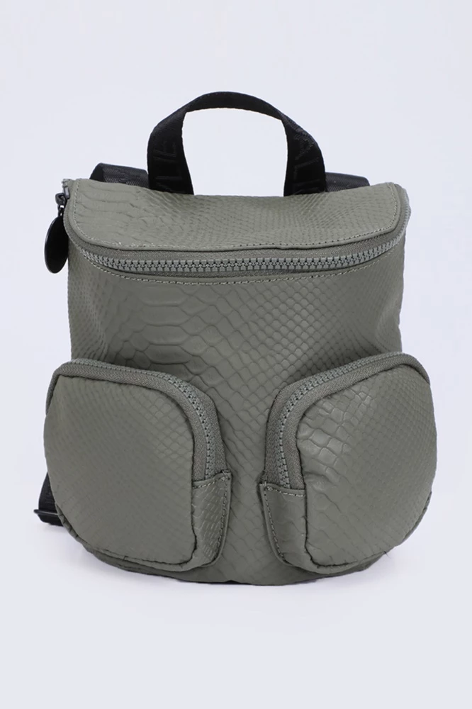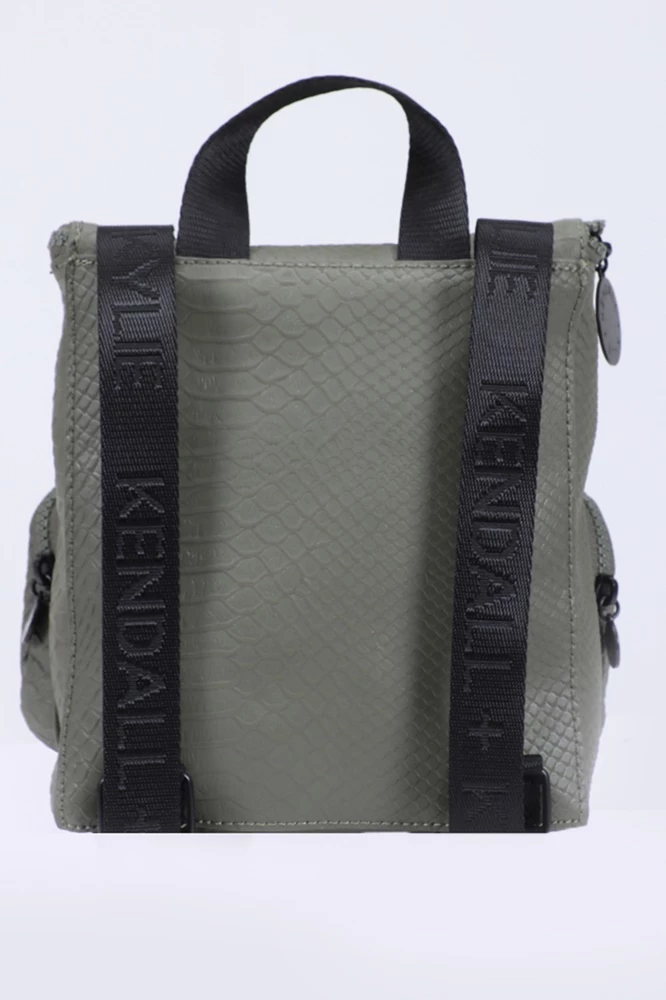Γυναικείο σακίδιο πλάτης Kendall + Kylie σε χακί χρώμα με all-over snake print. Διαθέτει χειρολαβή και ρυθμιζόμενους ιμάντες ώμου με Kendall + Kylie logo prints, κυρίως θήκη και δύο εξωτερικές τσέπες με κλείσιμο φερμουάρ.
