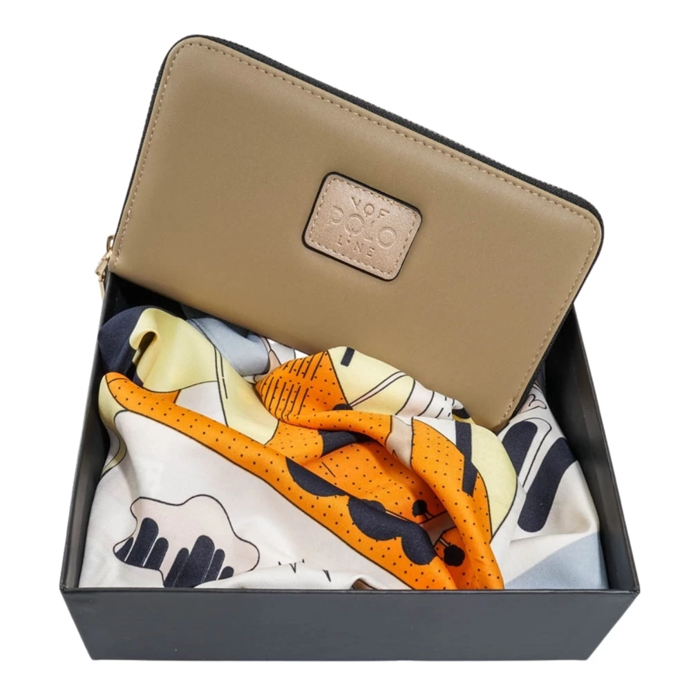 Μία πολυτελής συσκευασία δώρου που περιλαμβάνει ένα φουλάρι 19V69 ITALIA σε γκρι και μπεζ αποχρώσεις, με χρωματιστά μοτίβα σε όλη την επιφάνεια και ένα πορτοφόλι VQF POLO LINE σε μπεζ απόχρωση.