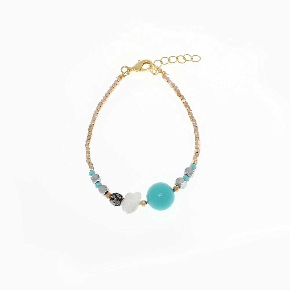 Γυναικείο βραχιόλι ERMINA KASS με χάντρες από αιματίτη ημιπολύτιμο λίθο σε χρυσή και τιρκουάζ απόχρωση. Έχει επίχρυσο ατσάλινο κούμπωμα που δεν μαυρίζει και δεν προκαλεί αλλεργίες