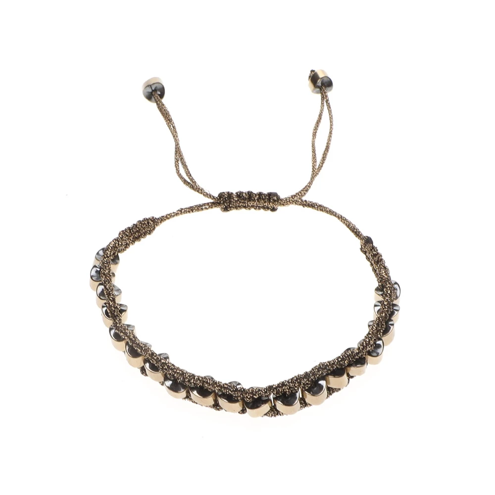 Γυναικείο πλεκτό βραχιόλι ERMINA KASS με χρυσές χάντρες από αιματίτη ημιπολύτιμο λίθο, περασμένες σε μεταλλικό βαμβακερό νήμα. Έχει μακραμέ κούμπωμα και αυξομειούμενο μήκος για να εφαρμόζει σε κάθε χέρι.