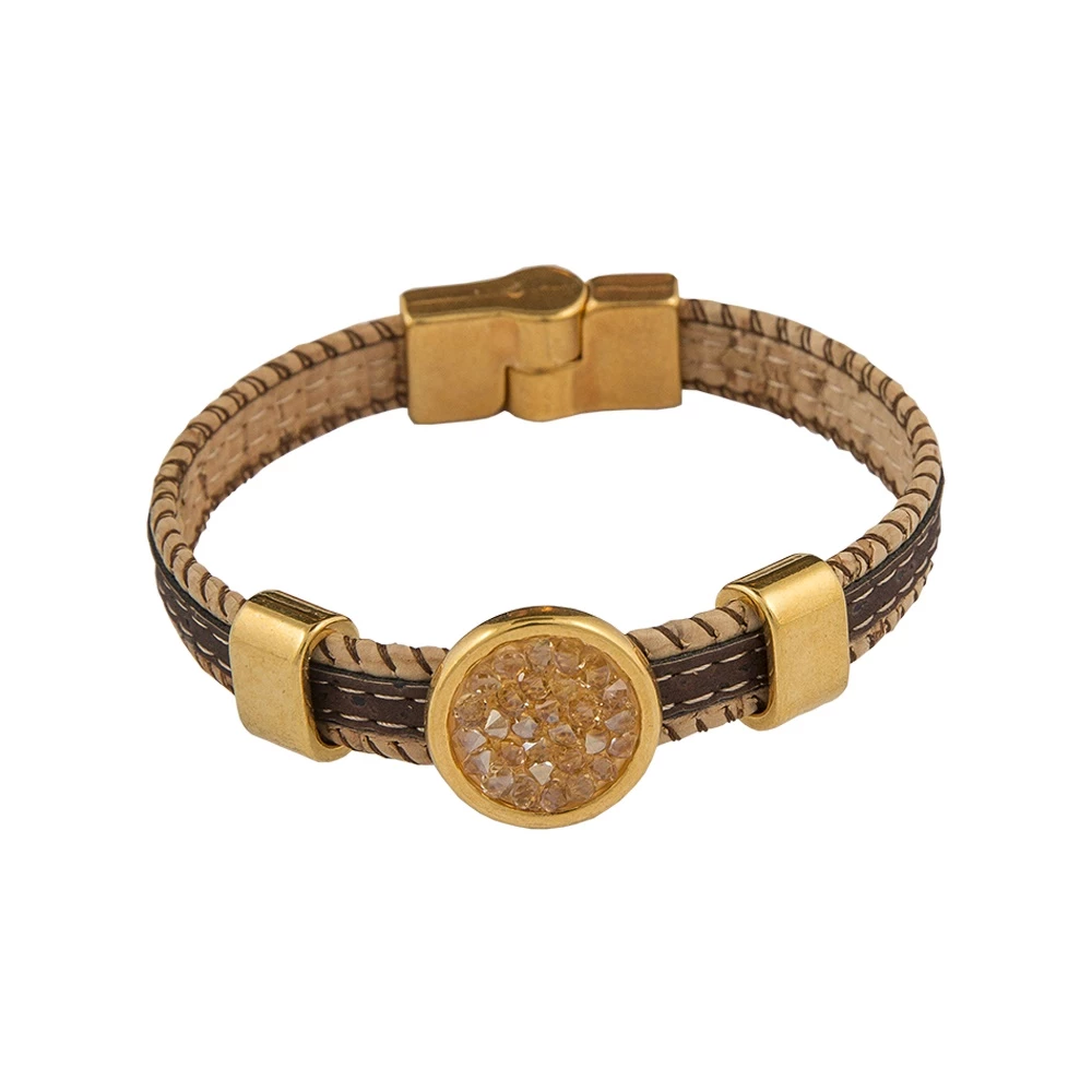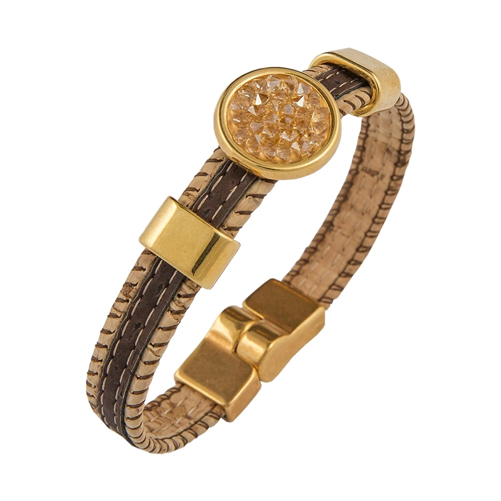 Γυναικείο βραχιόλι APOXYLO από φυσικό φελλό, με διακοσμητικές λευκές πέτρες swarovski σε χρυσή επιμεταλλωμένη βάση. Κλείνει με μαγνητικό κούμπωμα. Συνοδεύεται από χειροποίητο κουτί Apoxylo.