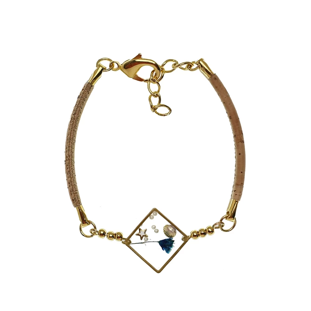 Γυναικείο βραχιόλι APOXYLO σε μπεζ χρώμα. Κατασκευασμένο από φυσικό φελλό με επίχρυσες μεταλλικές λεπτομέρειες και διακοσμητικό από υγρό γυαλί. Διαθέτει αυξομειούμενη αλυσίδα. Συνοδεύεται από χειροποίητο κουτί Apoxylo.