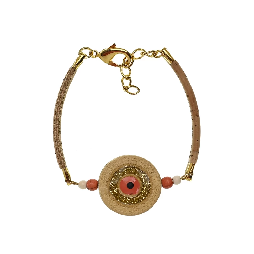 Γυναικείο βραχιόλι APOXYLO σε μπεζ χρώμα. Κατασκευασμένο από φυσικό φελλό με επίχρυσες μεταλλικές λεπτομέρειες και διακοσμητικό κεραμικό μάτι σε γήινο χρώμα. Διαθέτει αυξομειούμενη αλυσίδα. Συνοδεύεται από χειροποίητο κουτί Apoxylo.