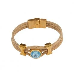 Γυναικείο βραχιόλι APOXYLO από φυσικό φελλό, με διακοσμητική μπλε πέτρα swarovski σε χρυσή επιμεταλλωμένη βάση. Κλείνει με μαγνητικό κούμπωμα. Συνοδεύεται από χειροποίητο κουτί Apoxylo.