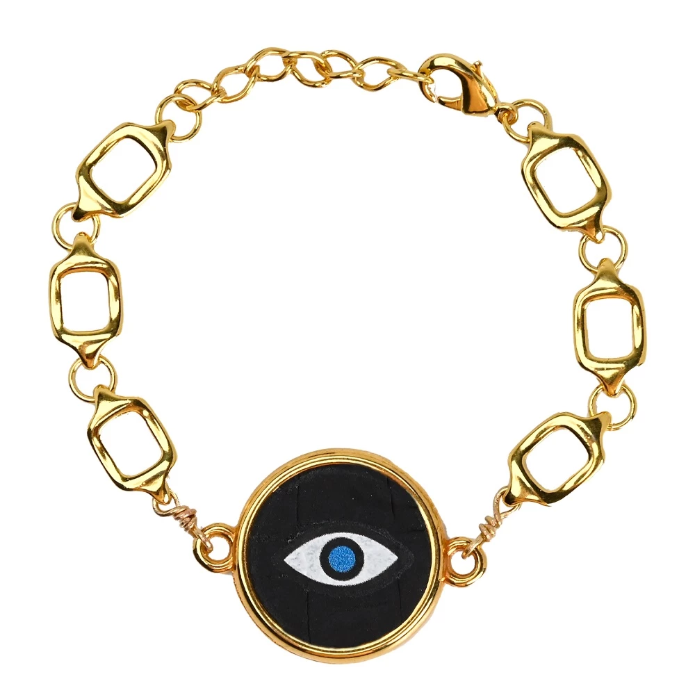 Γυναικείο βραχιόλι APOXYLO σε μαύρο χρώμα, με motif ματάκι. Κατασκευασμένο από φυσικό φελλό με επίχρυσες μεταλλικές λεπτομέρειες και αλυσίδα με τετραγωνισμένους κρίκους. Συνοδεύεται από χειροποίητο κουτί Apoxylo.