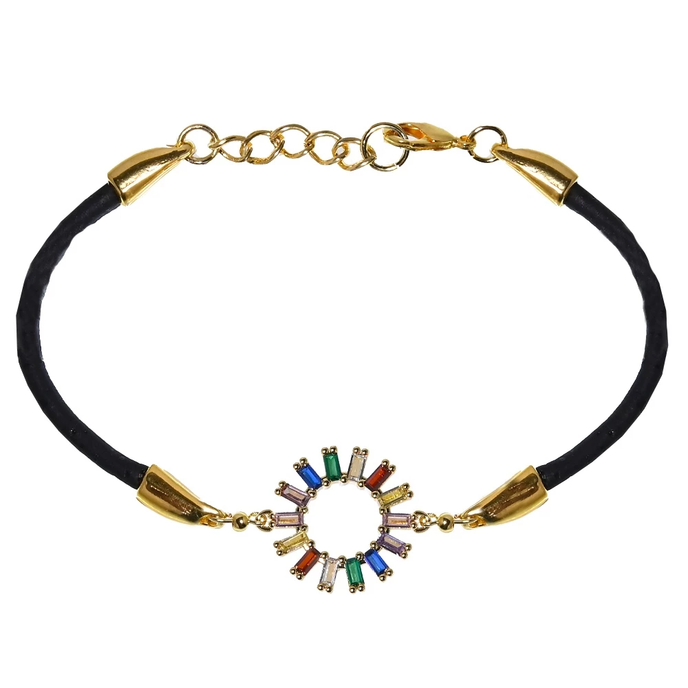 Γυναικείο βραχιόλι APOXYLO από κορδόνι φυσικού φελλού σε μαύρο χρώμα, με μοτίφ σε σχήμα κύκλου από ζιργκόν και επιχρυσωμένες μεταλλικές λεπτομέρειες. Συνοδεύεται από χειροποίητο κουτί Apoxylo.