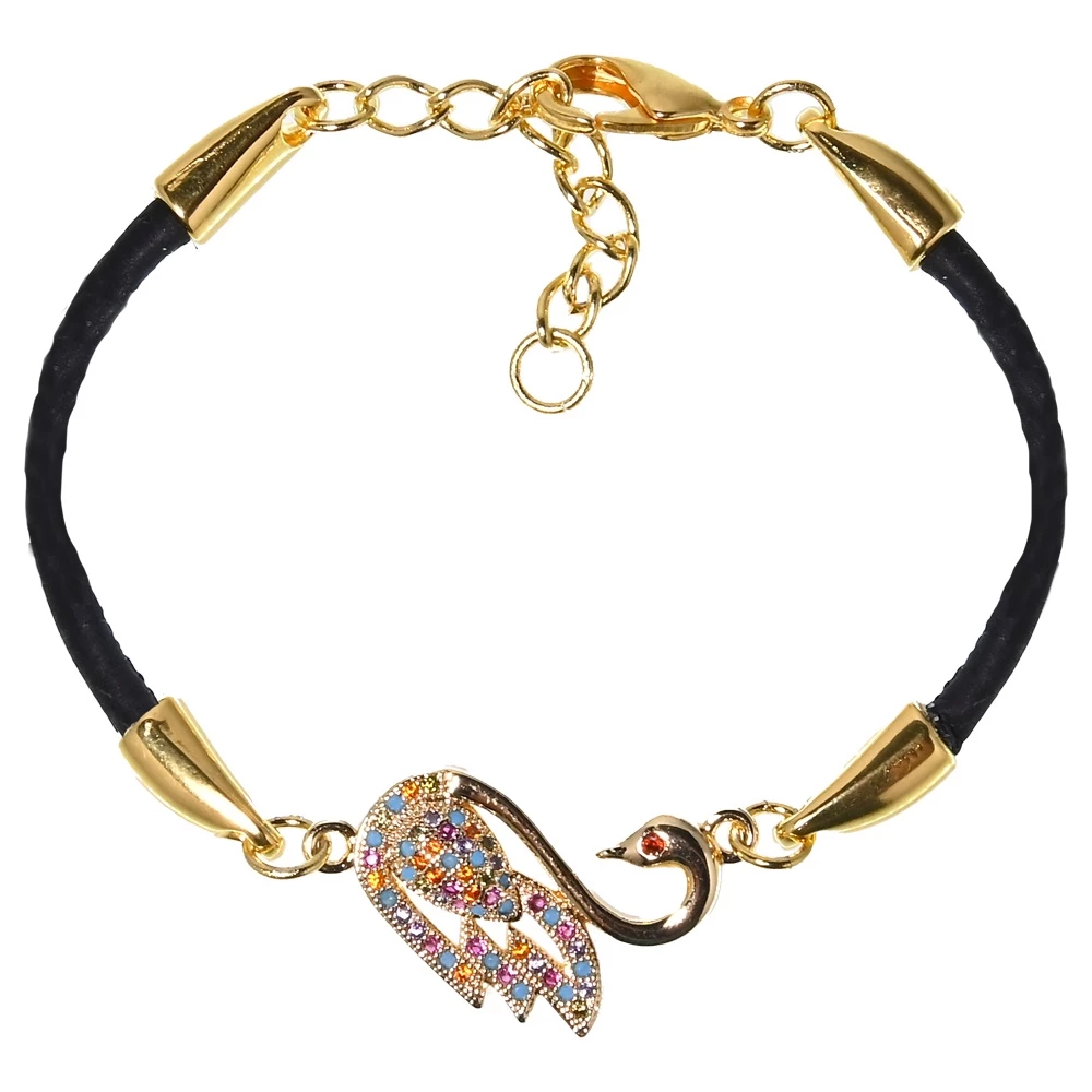 Γυναικείο βραχιόλι APOXYLO με κορδόνι από φυσικό φελλό σε μαύρο χρώμα, με μοτίφ σε σχήμα κύκνου με ζιργκόν και επιχρυσωμένες μεταλλικές λεπτομέρειες. Συνοδεύεται από χειροποίητο κουτί Apoxylo.
