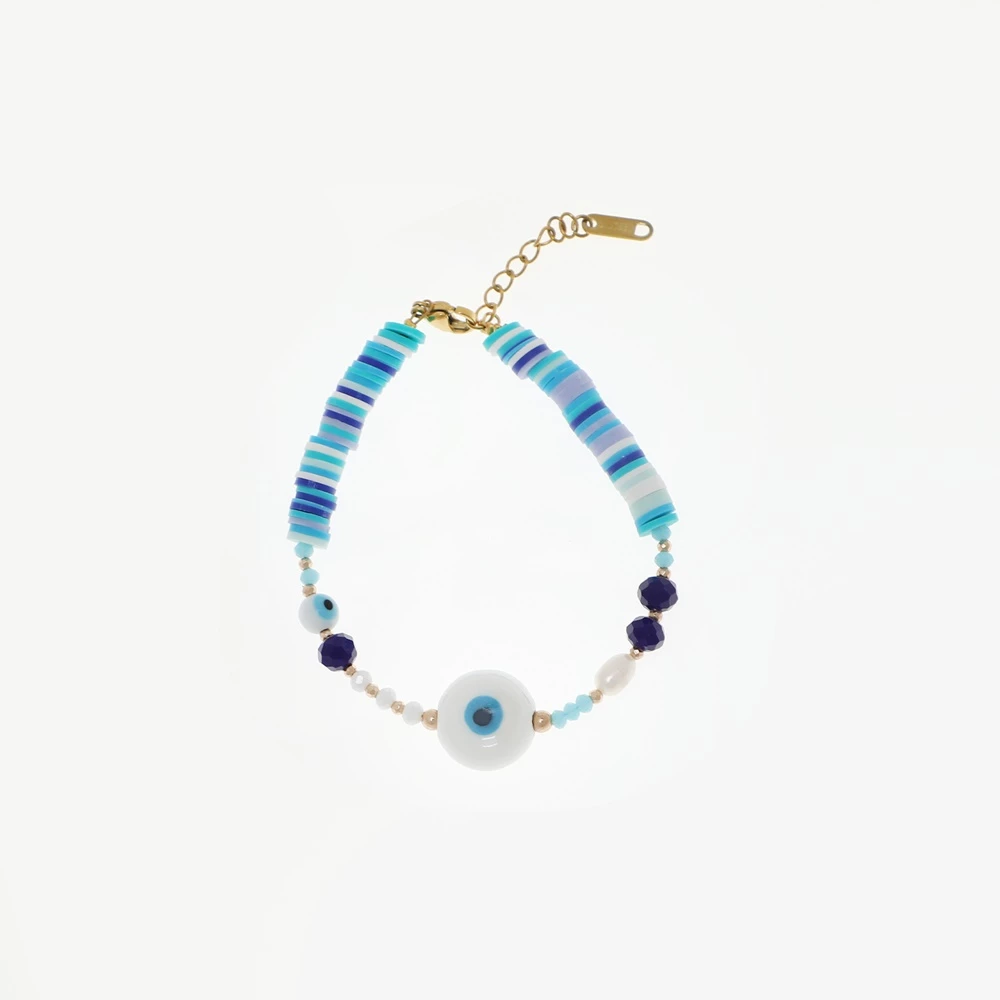 Γυναικείο βραχιόλι ERMINA KASS EVIL EYE BLUE CERAMIC σε μπλε αποχρώσεις με κεραμικό διακοσμητικό ματάκι. Έχει επίχρυσο ατσάλινο κούμπωμα που δεν μαυρίζει και δεν προκαλεί αλλεργίες.