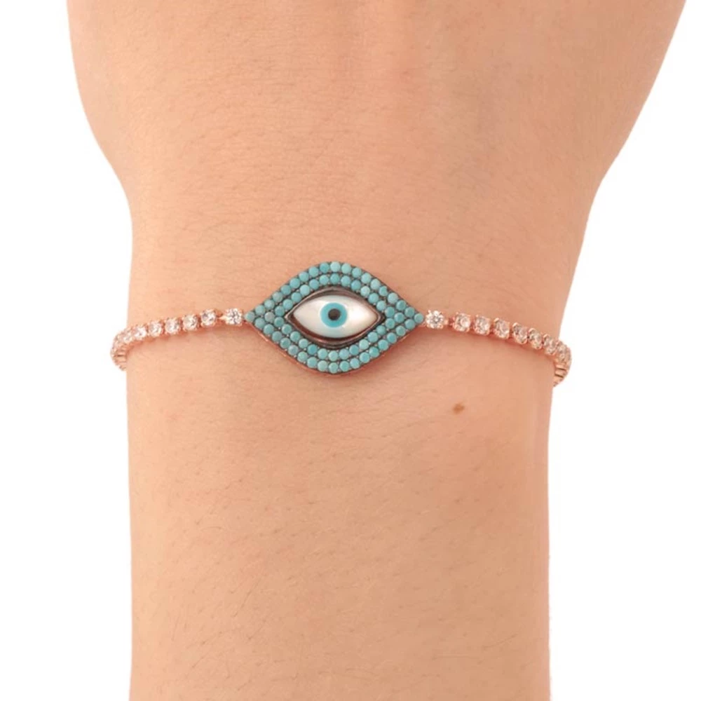 925 ρόζ επιχρυσωμένο βραχιόλι Μάτι Τιρκουάζ πέτρες με σειρέ Μονόπετρα λευκά