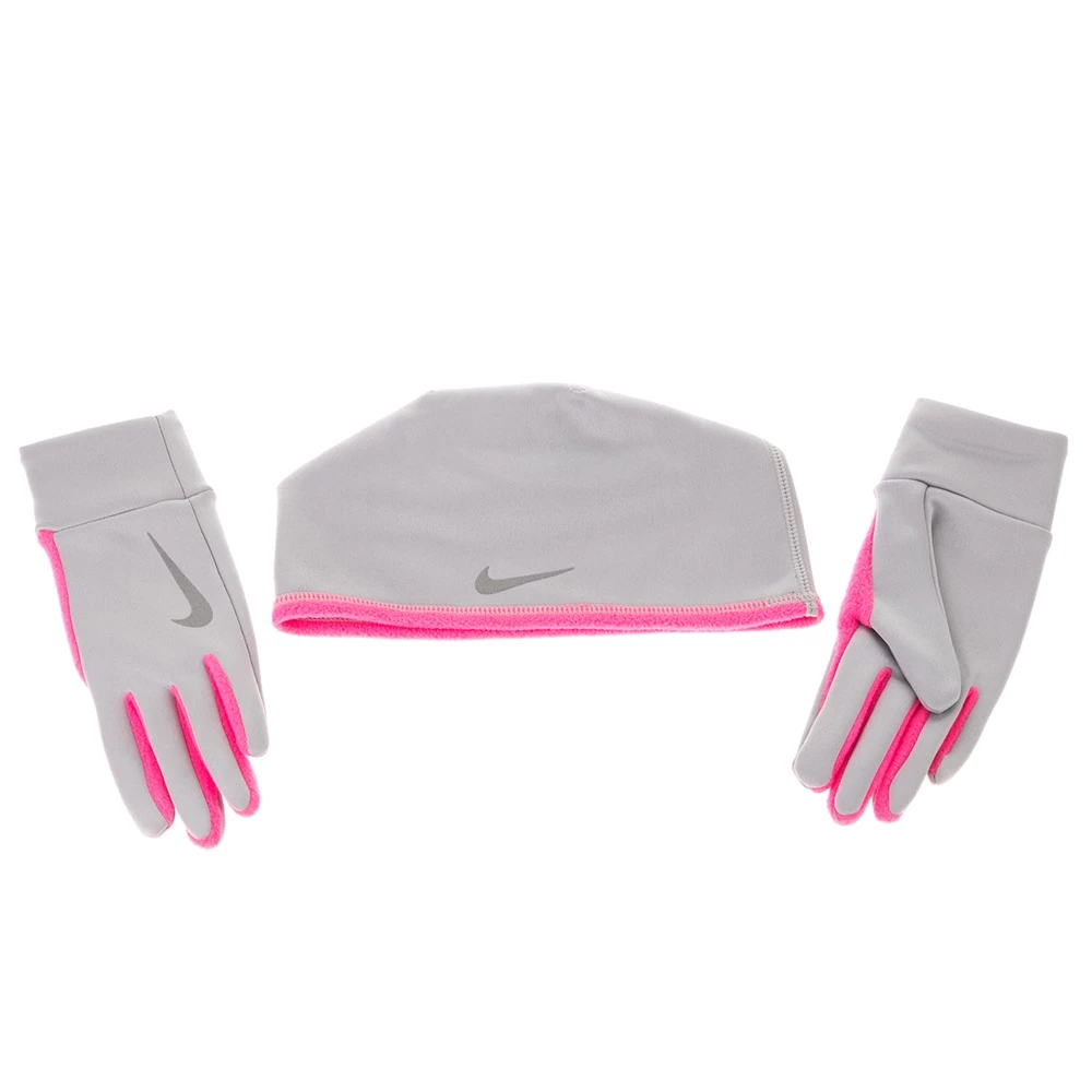 Γυναικείο σετ από σκούφο και γάντια NIKE σε γκρι και ροζ απόχρωση με τύπωμα το εμπορικό σήμα Swoosh. Ελαστική ύφανση για σταθερή εφαρμογή. Από ζεστό fleece ύφασμα με τεχνολογία Therma-Fit για προστασία από το κρύο. Ανακλαστικές λεπτομέρειες για καλύτερη ορατότητα σε συνθήκες χαμηλού φωτισμού. Ιδανικά για τρέξιμο.