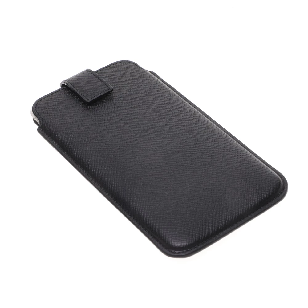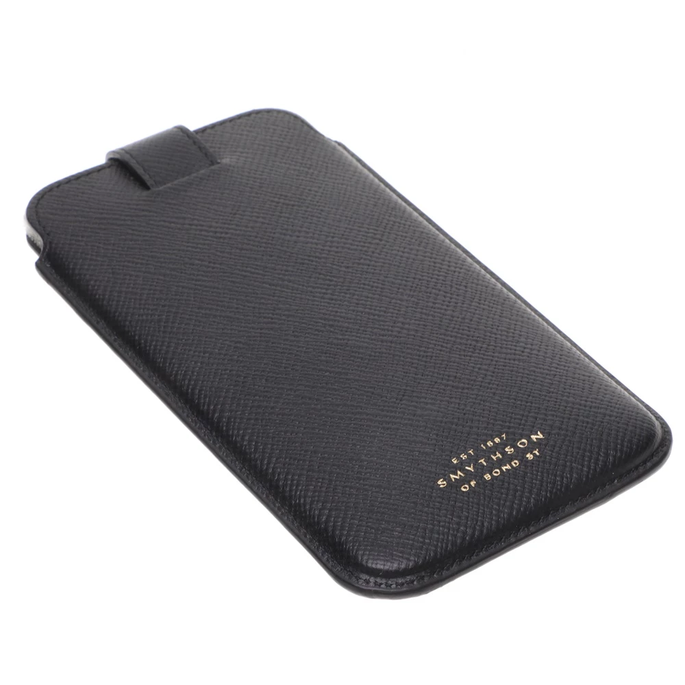 Δερμάτινη προστατευτική θήκη κινητού SMYTHSON PANAMA σε μαύρο χρώμα. Κατάλληλη για τα μοντέλα iPhone 6/6s/7 και Samsung Galaxy S6 Edge Plus. Λουράκι με κουμπί στο επάνω μέρος.