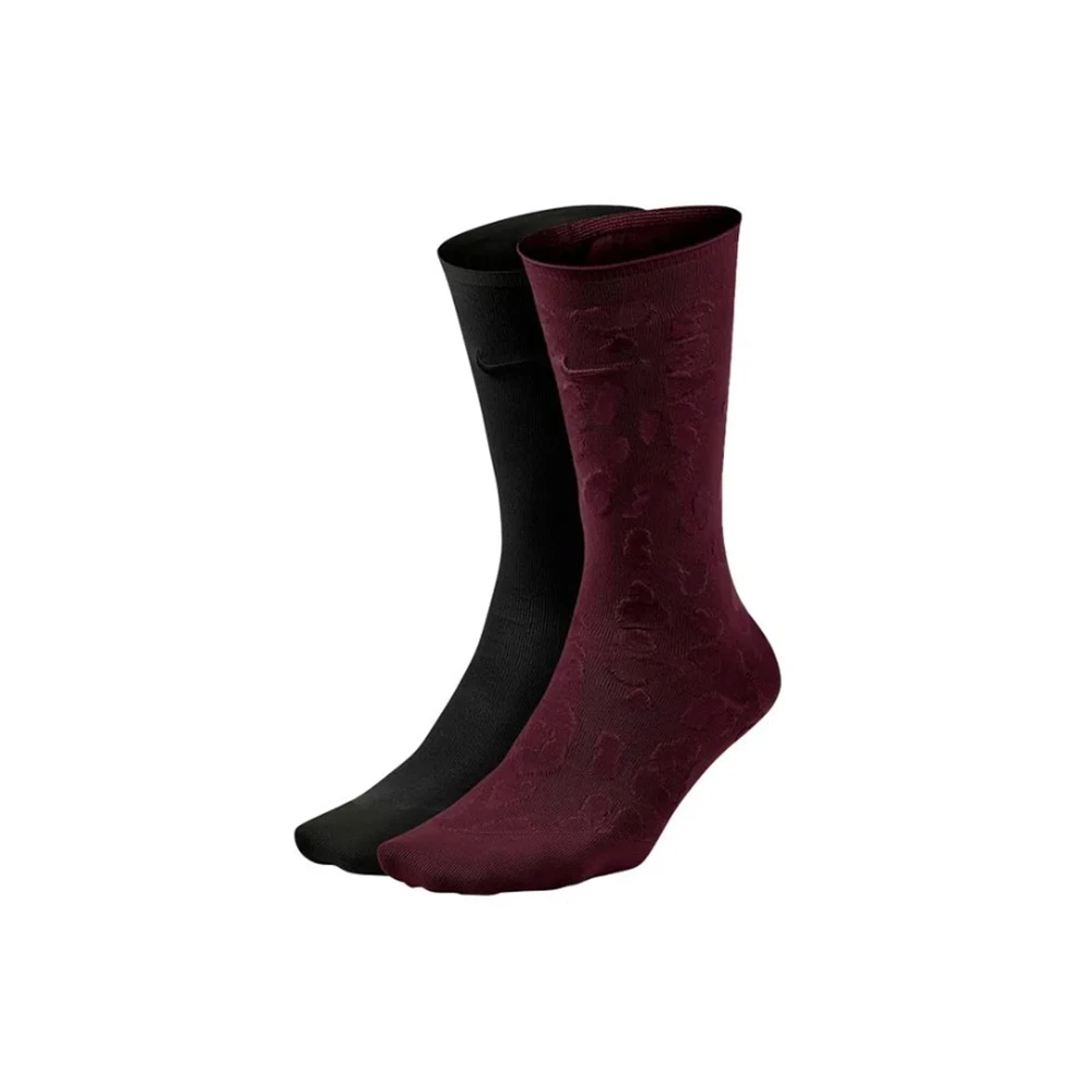 Σετ από 2 ζευγάρια κάλτσες NIKE σε μαύρο και μπορντό χρώμα. Έχουν ανάγλυφο leopard μοτίβο και μήκος μέχρι το μέσο της γάμπας.