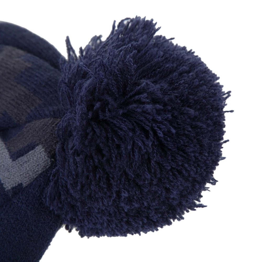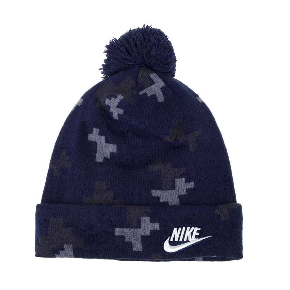 Unisex σκούφος σε μπλε απόχρωση με γεωμετρικό μοτίβο, λογότυπο του οίκου μπροστά και διακοσμητική φούντα στο πάνω μέρος.